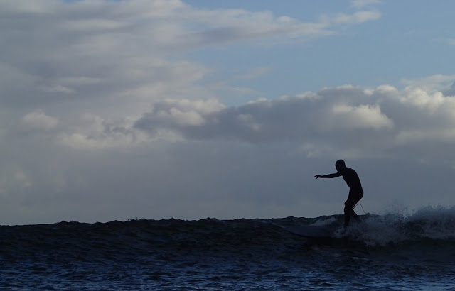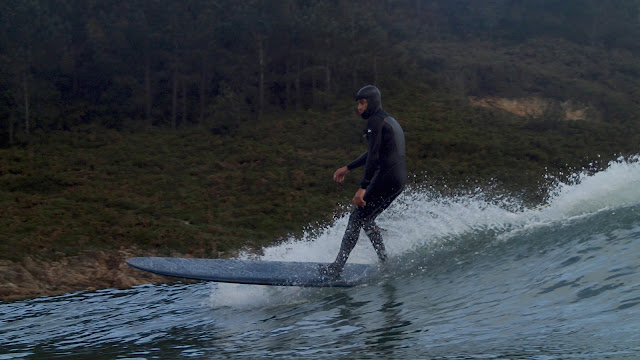El agua no parecía estar especialmente fría, aunque al poco de entrar tuvimos que acelerar la remada para atravesar la corriente que lleva el agua del río al mar, y que estos días baja más fría de lo normal por las lluvias y el tiempo gélido de las semanas pasadas. El viento también soplaba frío, sobre todo en las rachas que de vez en cuando entraban directamente desde el mar. Pero con el cuerpo aún caliente de la caminata, y con las olas que veíamos romper, pronto nos olvidamos del frío. La luz era también muy buena, sobre todo en los ratos en los que asomaba el sol, así que entre ola y ola podría sacar alguna foto, en un lugar que además, y por su entorno, es especialmente agradecido.